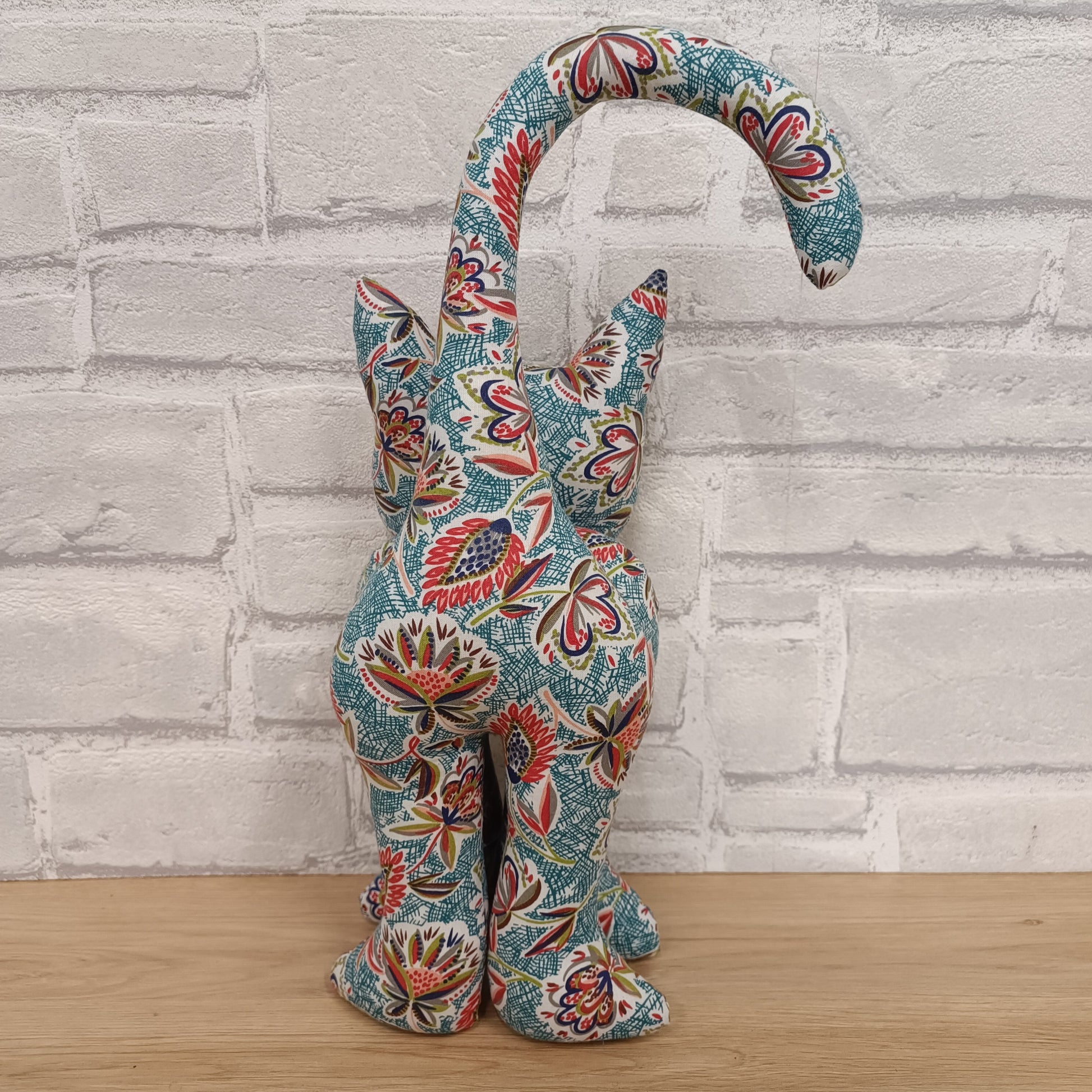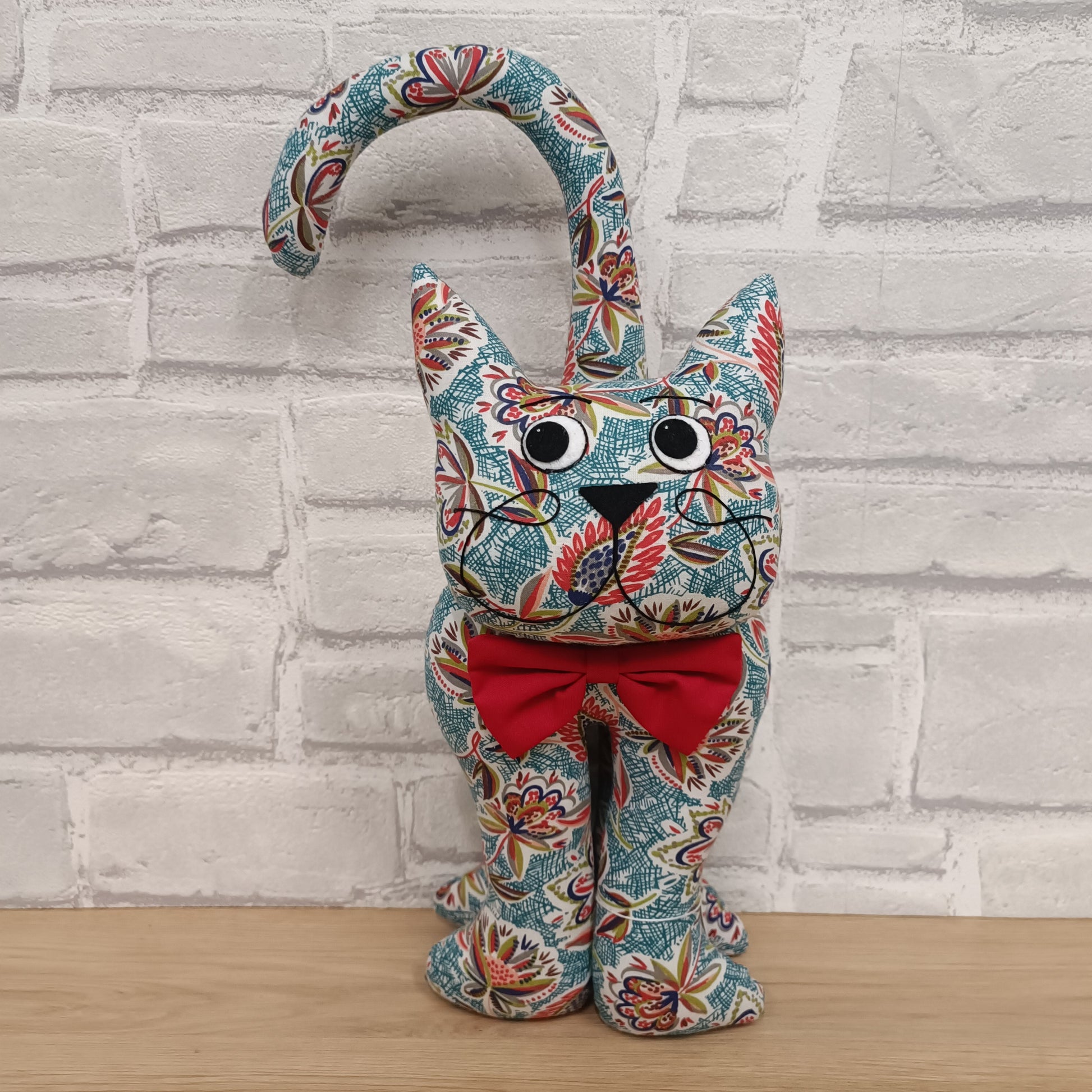 Pour les amoureux des chats, nous vous proposons deux tailles de chat en tissus. Ici, le grand chat, d'une hauteur de 38cm, apportera à votre déco une note gaie et originale.