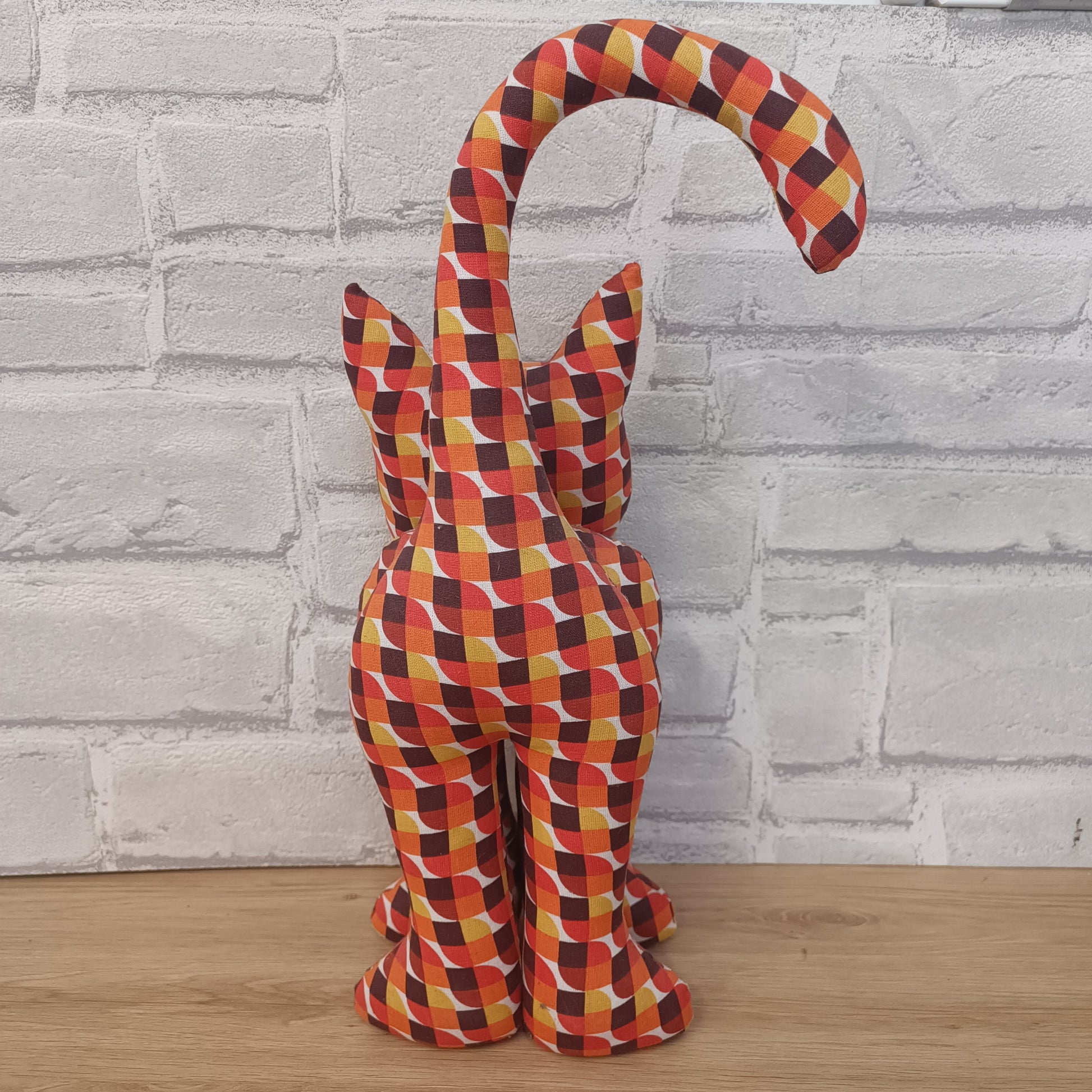 Pour les amoureux des chats, nous vous proposons deux tailles de chat en tissus. Ici, le grand chat, d'une hauteur de 38cm, apportera à votre déco une note gaie et originale.