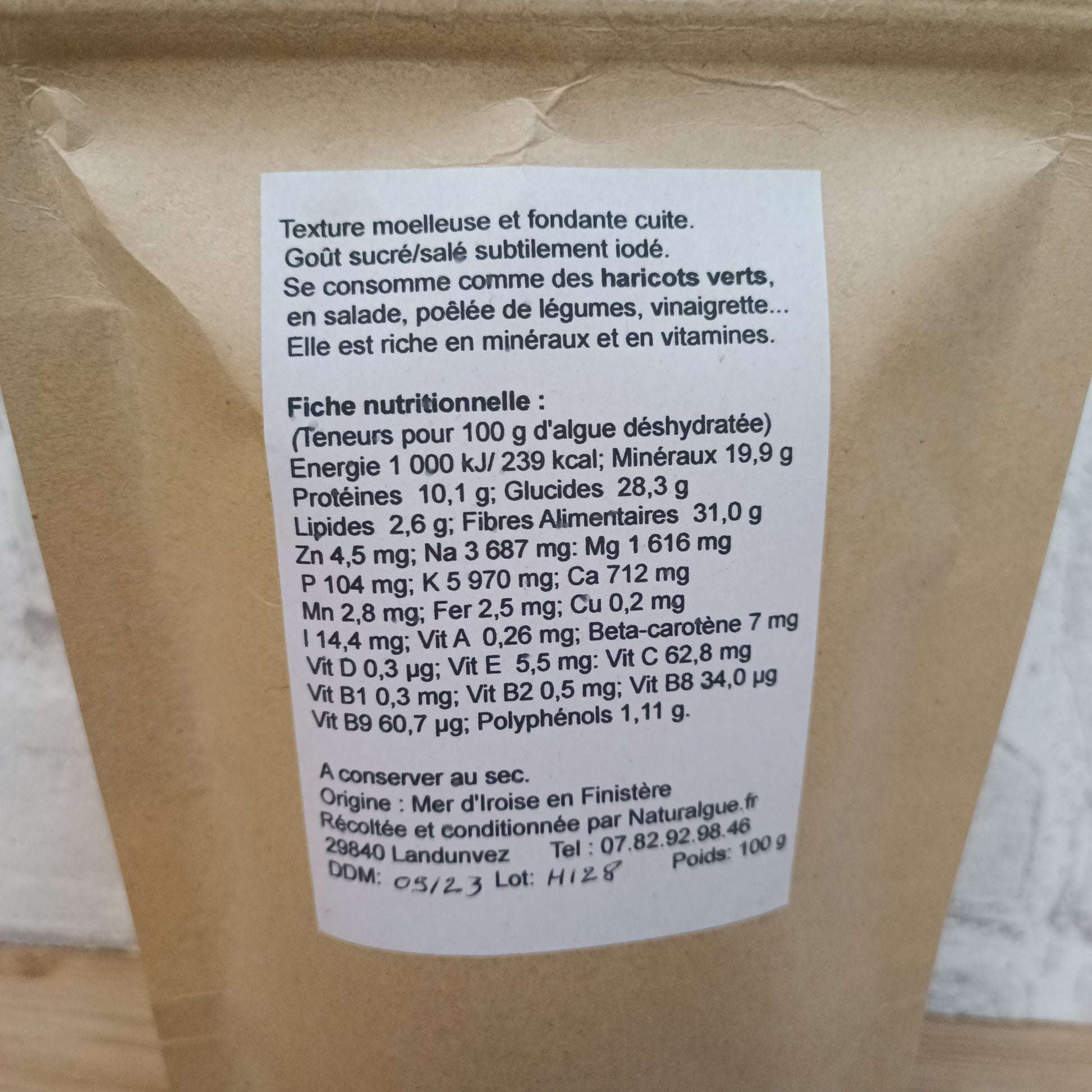 Récoltée à la main par Naturalgue en mer d'Iroise (Parc Marin d'Iroise) dans le Finistère nord en appliquant les principes d'une cueillette écoresponsable et durable.